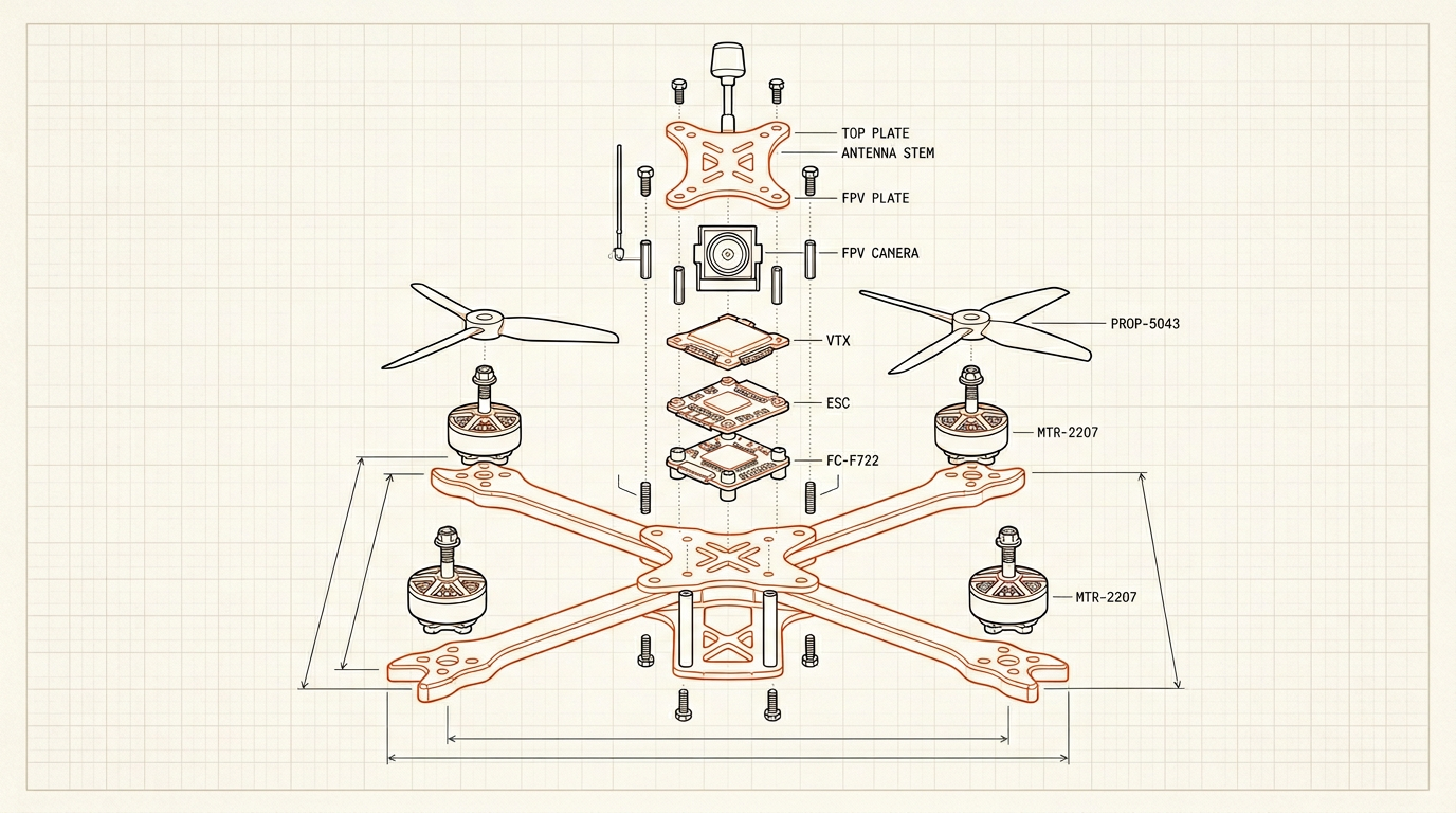 Describe the job, not the drone. DRONA classifies your intent, picks the form factor, and returns a complete build. Every part compatible. Every price live. Every spec physics-valid.